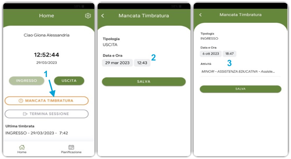 - Se hai dimenticato di timbrare l’uscita del turno precedente oppure l’ingresso del turno stesso seleziona mancata timbratura per inserire a mano l’orario effettivo.