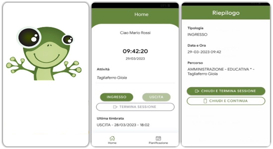 - Dalla HOME: Seleziona la direzione: ingresso/uscita. In basso visualizzi la tua ultima timbrata.