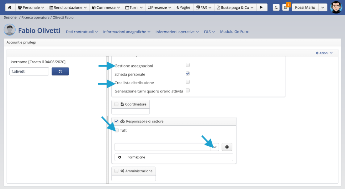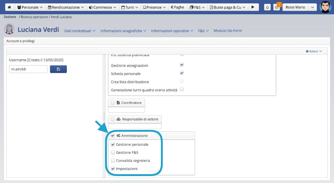 • * Per una gestione completa del modulo F&S selezionare anche il flag Impostazioni e aggiungere i privilegi di coordinamento/responsabile di settore in base a come si è organizzato il modulo.