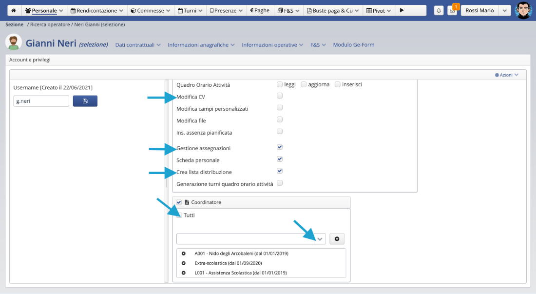 N.B. i flag nella sezione operatore consentono al Coordinatore: