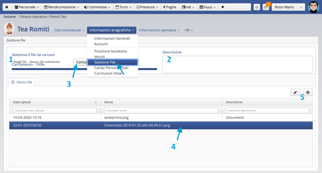 – Operatori con il flag sul privilegio account “Gestione file” possono caricare, scaricare, modificare ed eliminare i file.