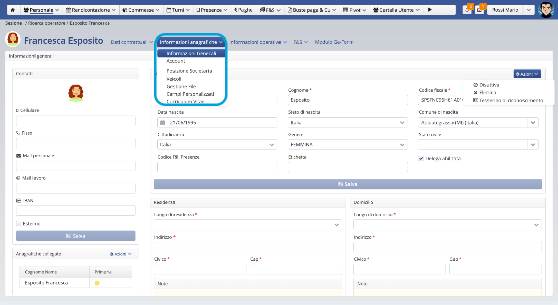 • accede alla scheda personale degli operatori che sono assegnati sulle attività delle commesse da lui coordinate. Può così visualizzare dati contrattuali, anagrafici, gli incarichi, attestati e piano sanitario.