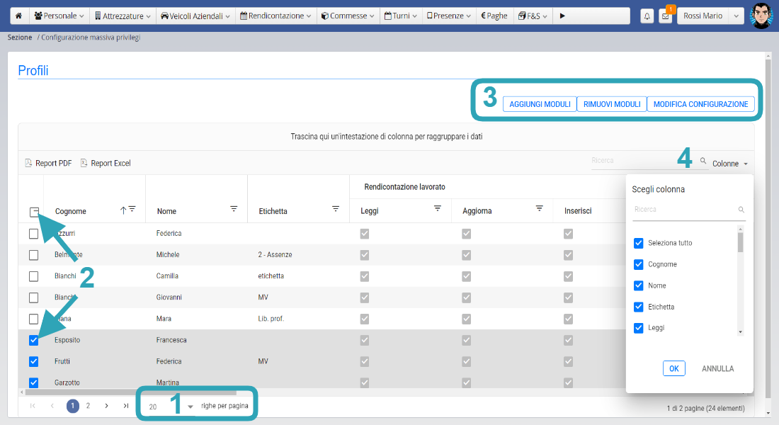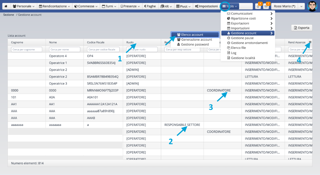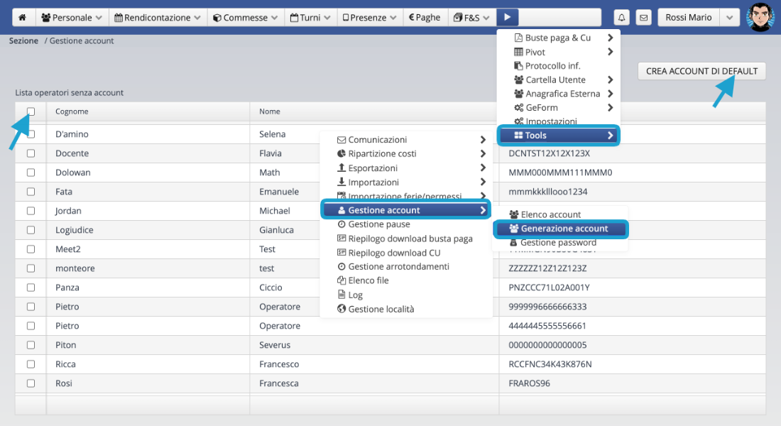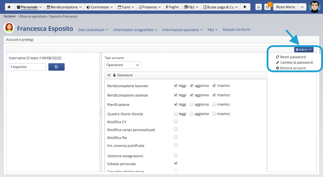 • Gestione personale: accesso completo al menu del Personale.