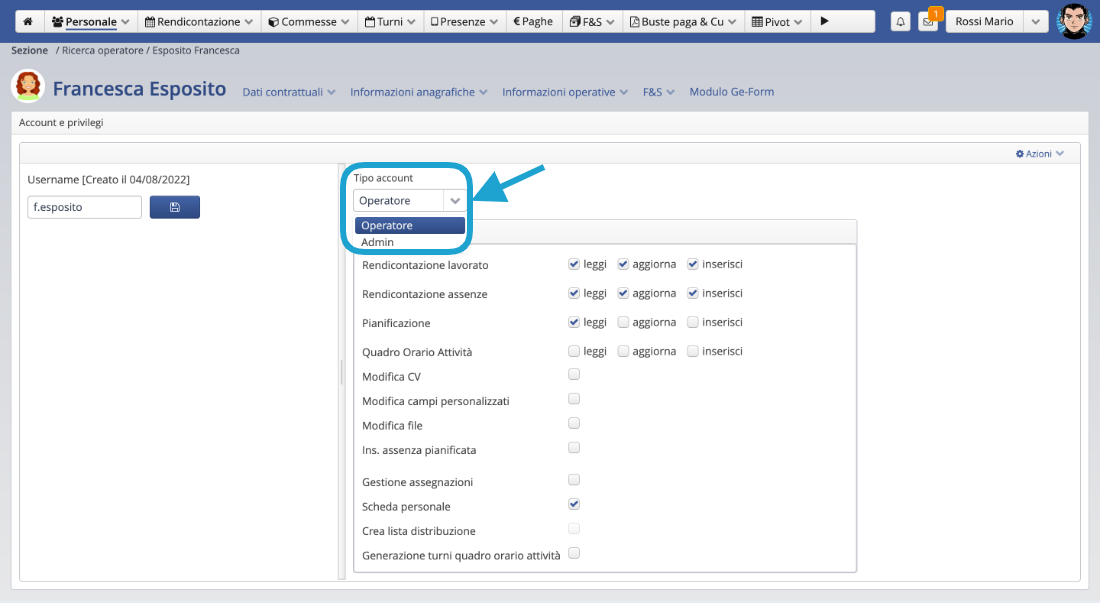 • modificare i dati contrattuali degli operatori di cui ha accesso.