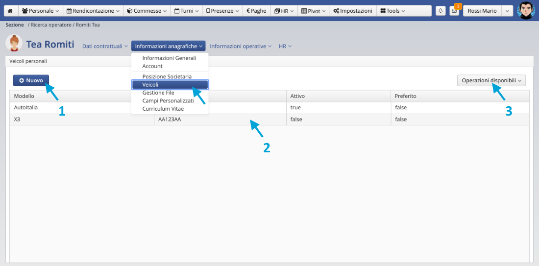 Informazioni anagrafiche dell’operatore > Veicoli: obbligatorio per inserire il rimborso kilometrico.