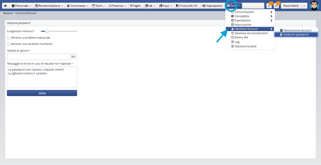 Dal Menu Tools > Gestione Account > Gestione Password