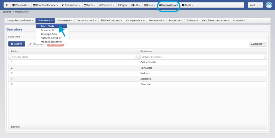 Lo Stato civile puoi modificarlo in origine dal menu Impostazioni > Operatore > stato civile.