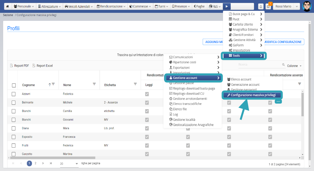 Dal Menu Tools > Gestione Account > Configurazione massiva privilegi