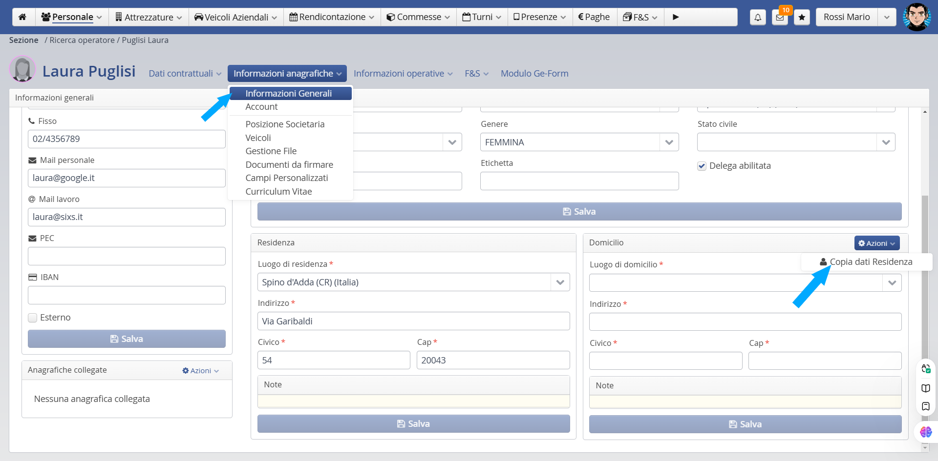 Puoi copiare in maniera massiva i dati di residenza nel domicilio dal menu del Personale: